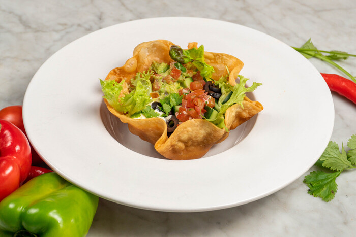 Tortilla tepung renyah yang disajikan dengan topping kacang merah, daging sapi giling, selada campur, jagung, mentimun, zaitun hitam, dan keju mozzarella ini cocok dijadikan penganan pembuka/snack. Disajikan dengan guacamole, pico de gallo, dan krim asam, Tostada Salad ini menghadirkan citarasa yang fresh.