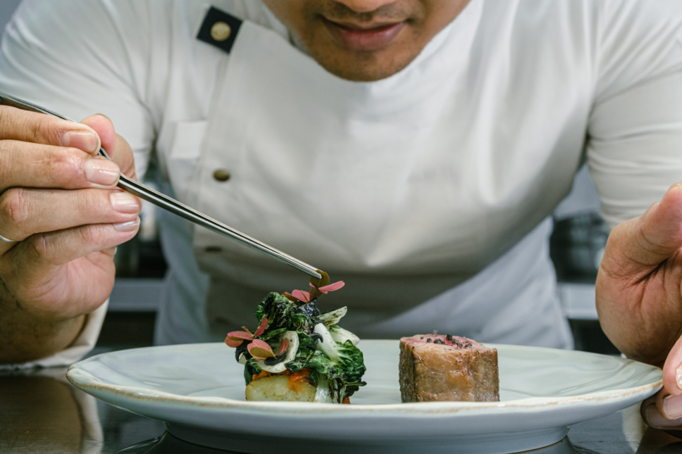 Guest Chef Oliverra Tables kali ini, Gunartha Tude dari Dome by Potato Head, menyajikan interpretasi olahan ikan yang disempurnakan dan dipadukan dengan jus andaliman, jeli kopi, dan acar bunga jahe. Dengan keasaman yang tajam serta aroma kompleks, hidangan ini menawarkan kontras yang segar serta mencerminkan pendekatan restonya yang berfokus pada bahan baku yang terinspirasi alam.